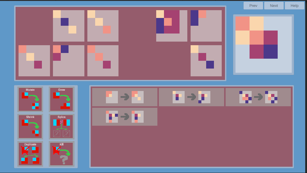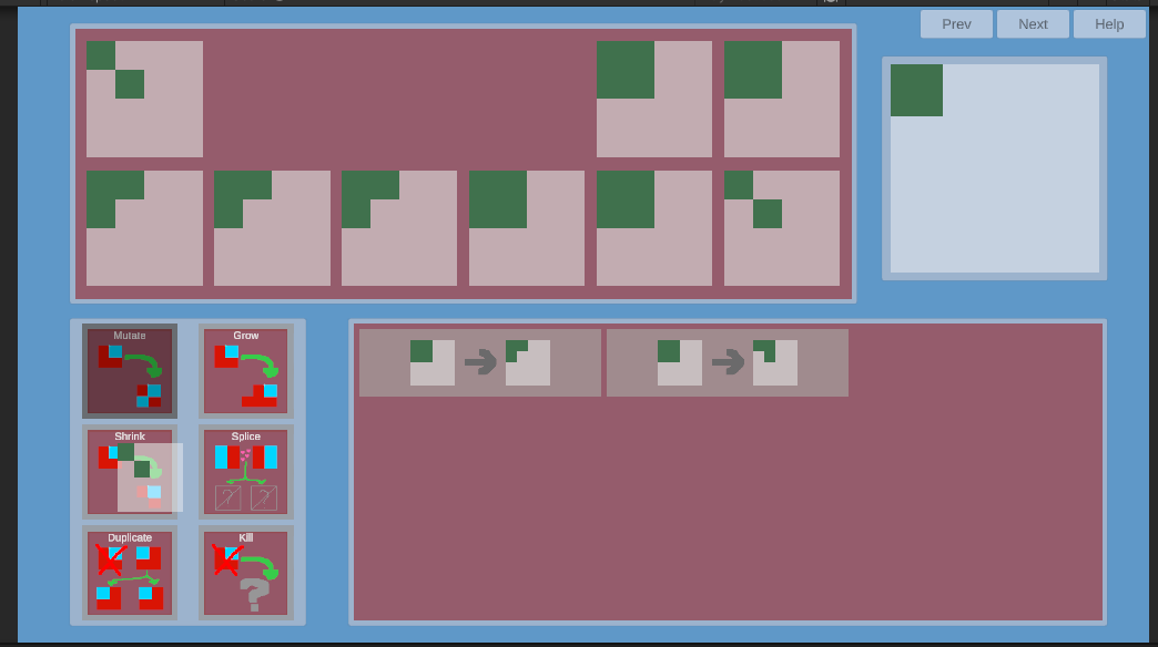 Really cool concept that you've created. It was however, a little too complex for me to figure out cause there are instances where I'll do the same action on the same shape and color of an organism (for instance the shrink) and somehow get two different results. Great idea but I just need more visual aids or examples on how the logic works for the actions.